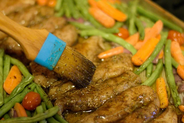 - Brush the chicken and vegetable with the rest of the marinade and return to the oven for 15 more minutes.