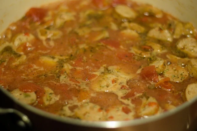 When the chicken sausage is browned, add the can of diced tomatoes.